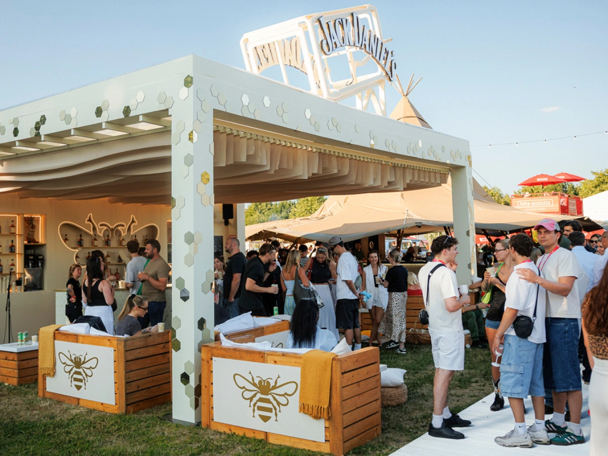 The combination of industrial finishes and strong brand colours created a bold, recognisable space that resonated perfectly with festival audiences.